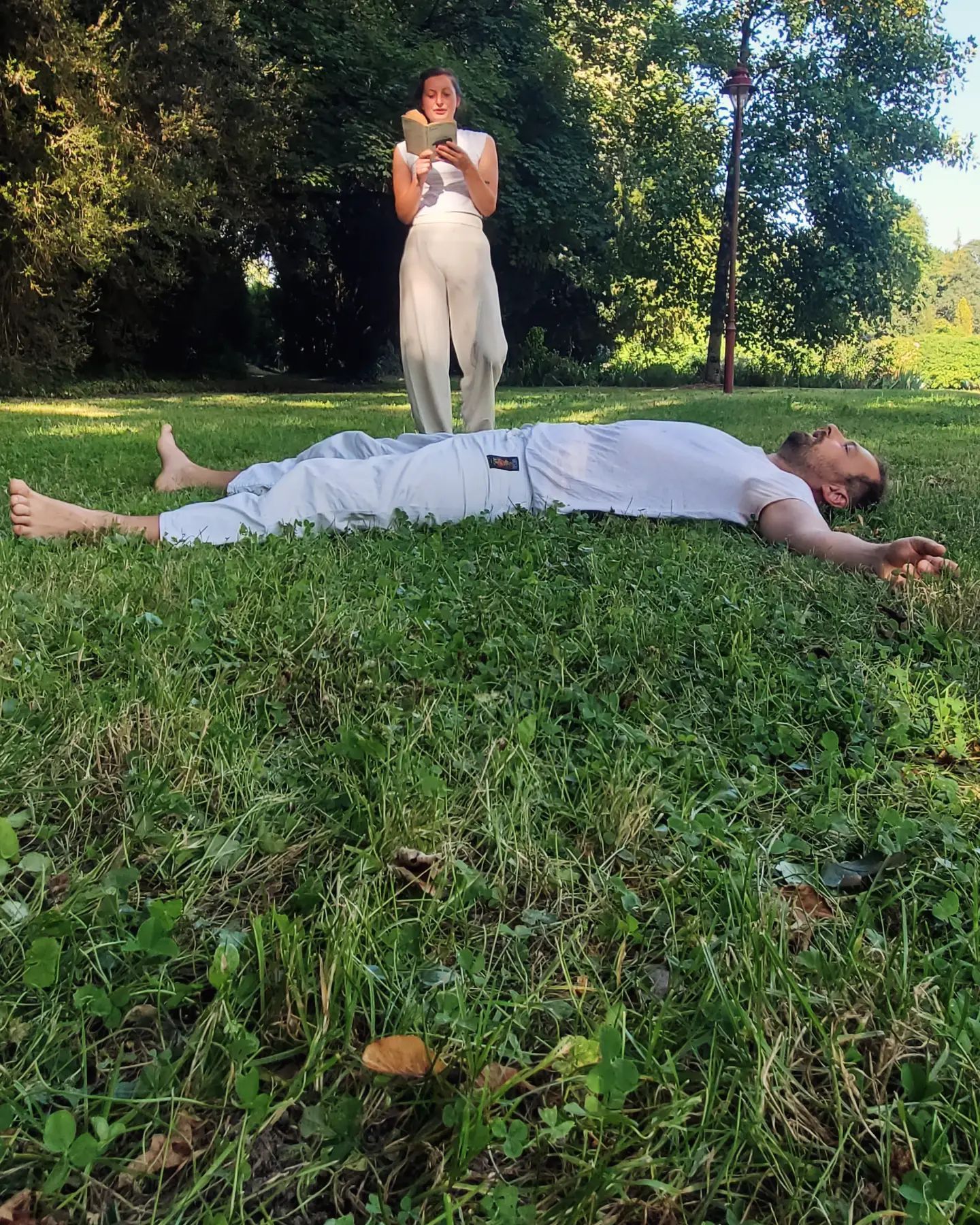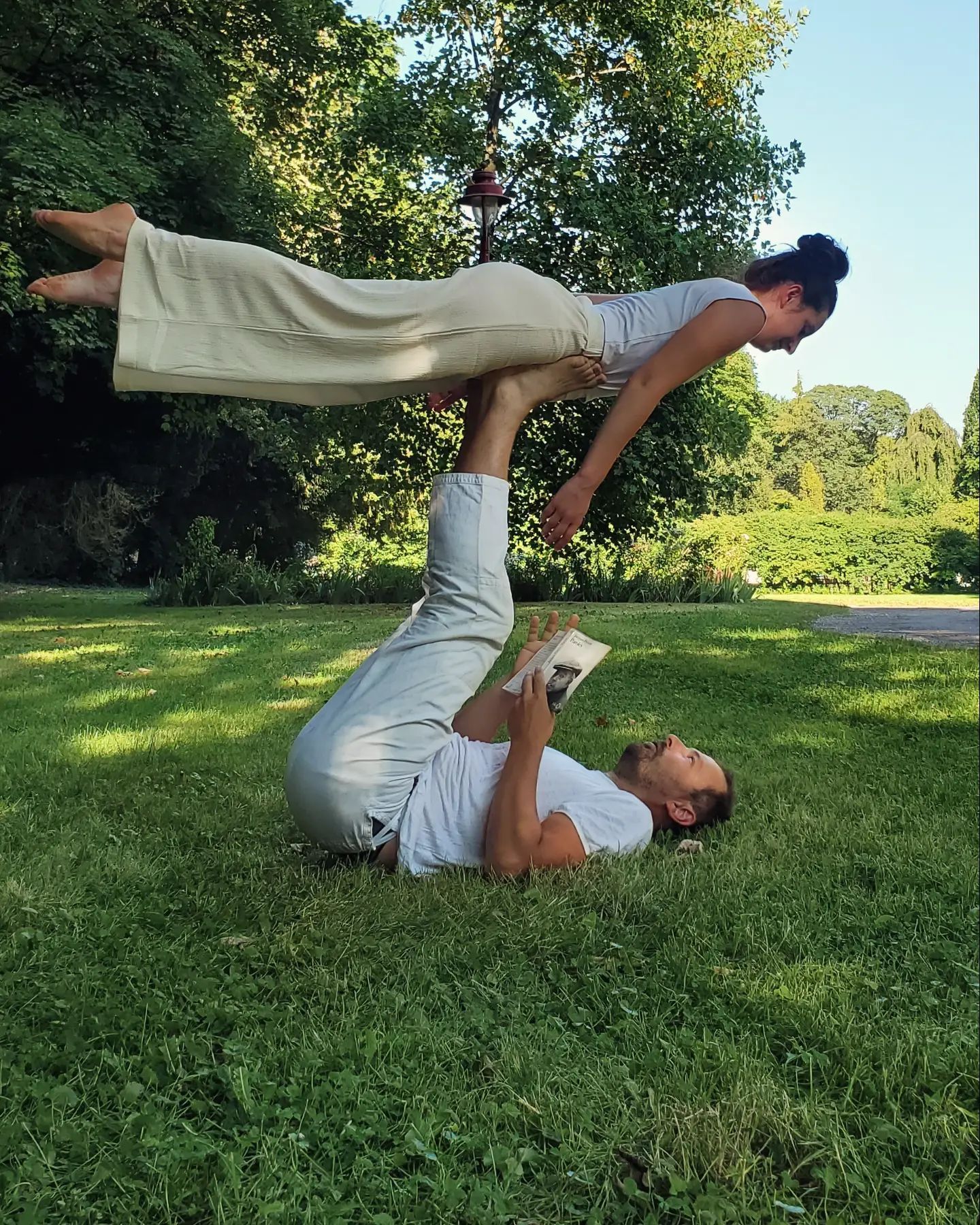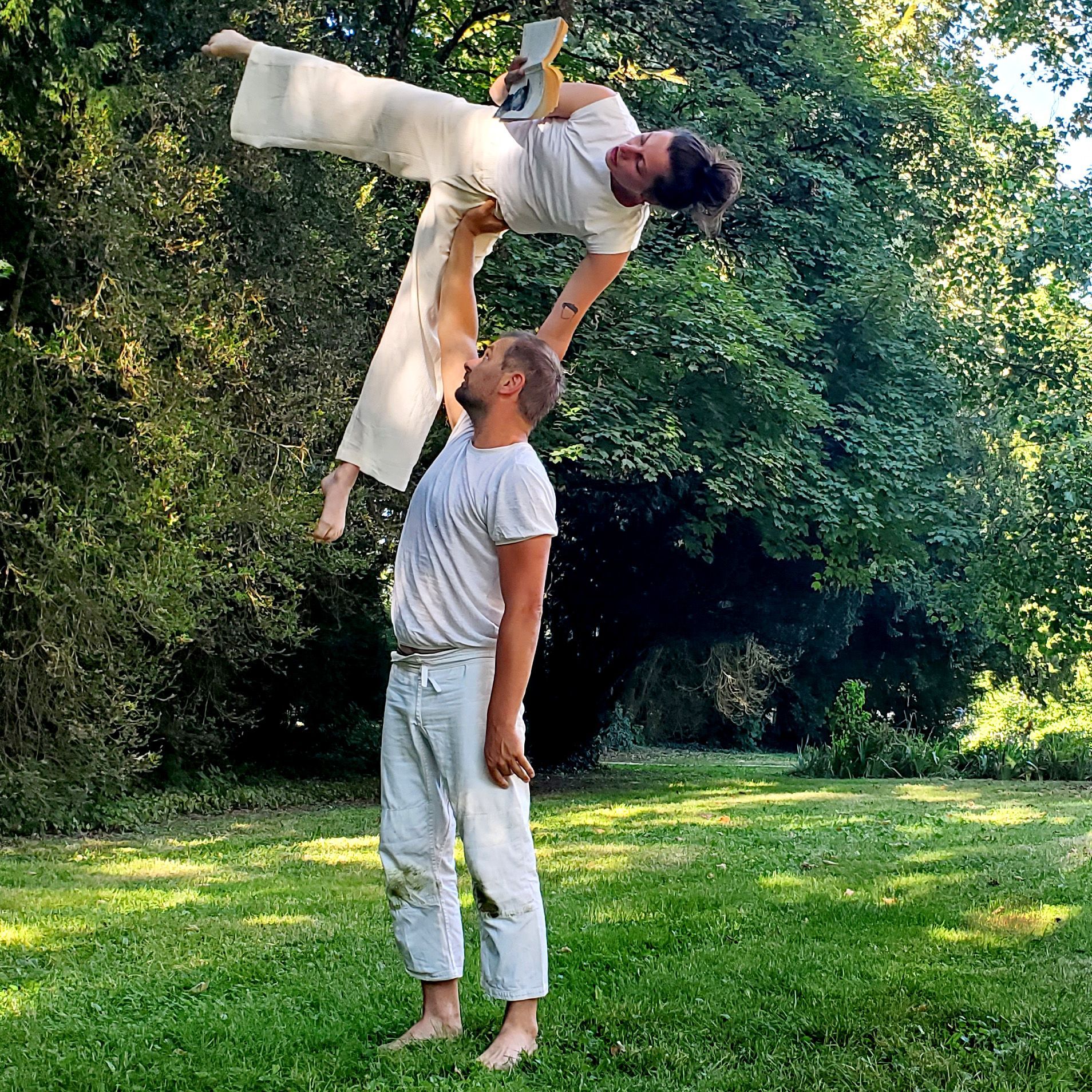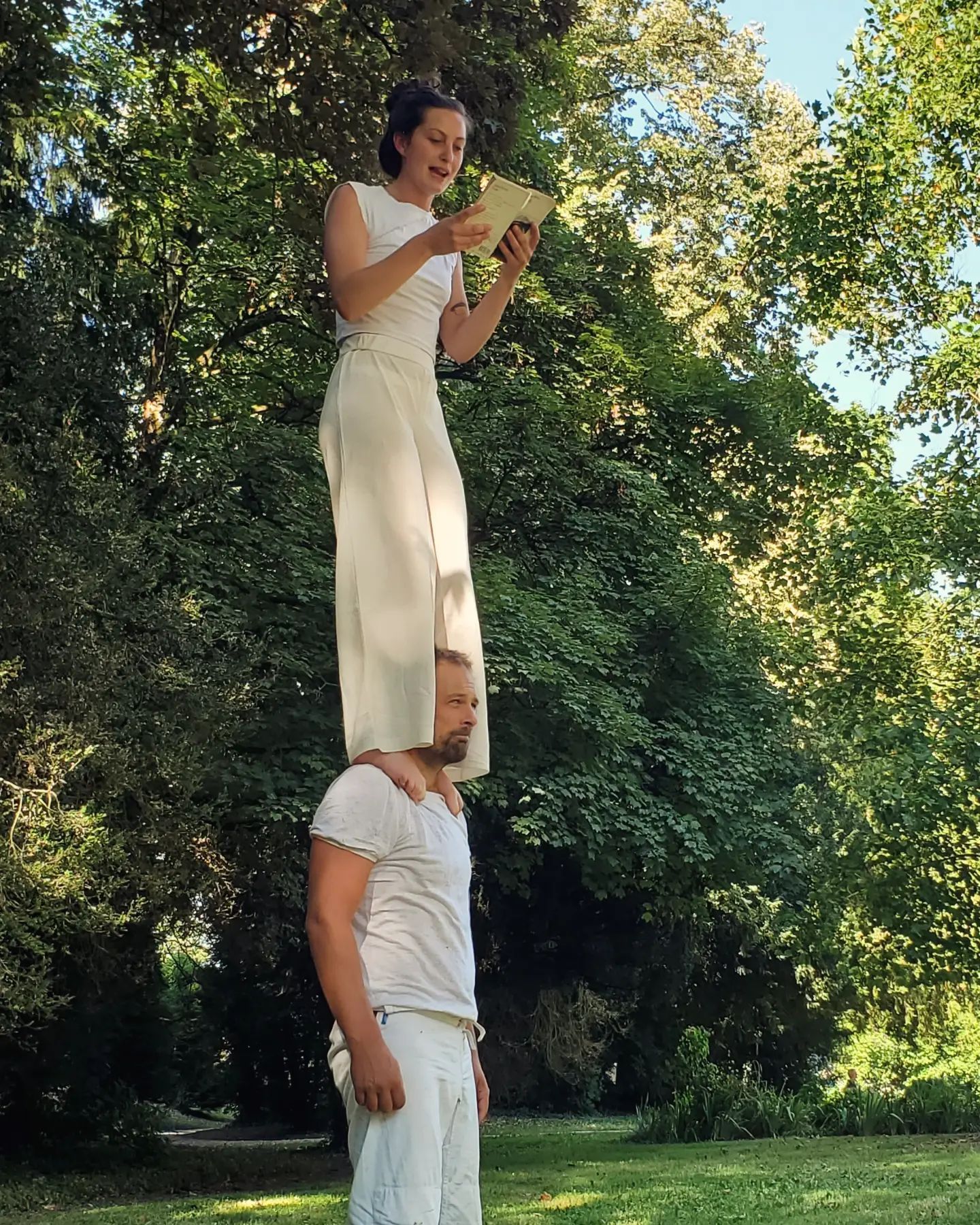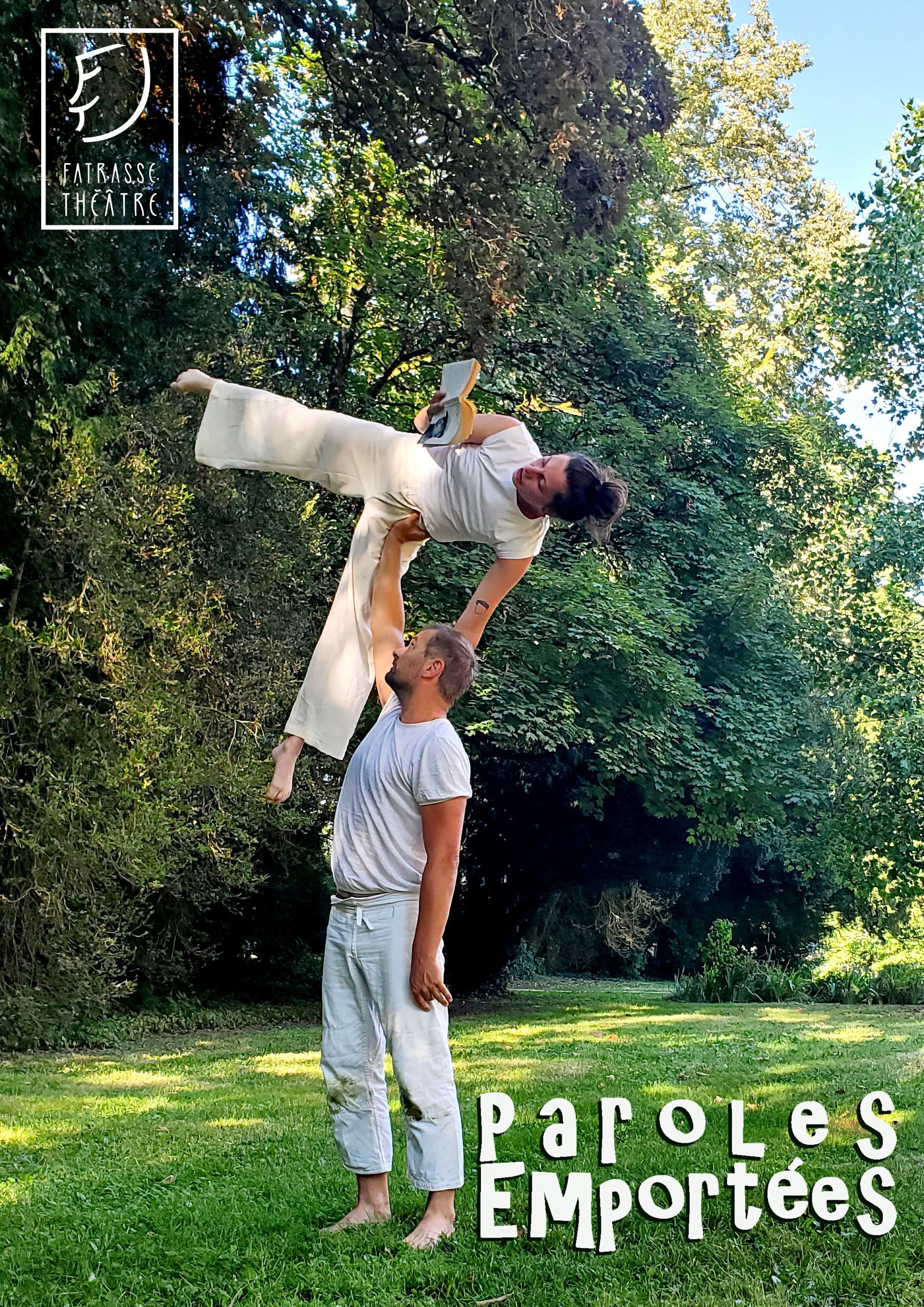 Deux acrobates déambulent en éxecutant des porters de cirque, en légèreté et suspension, tout en lisant des poèmes du recueil “Paroles” de Jacques Prévert.