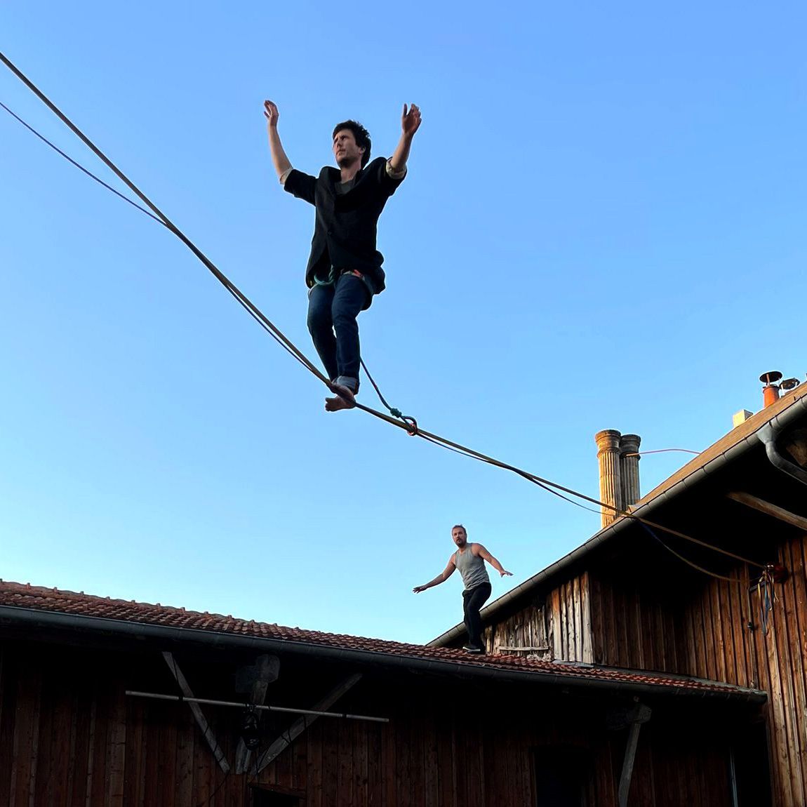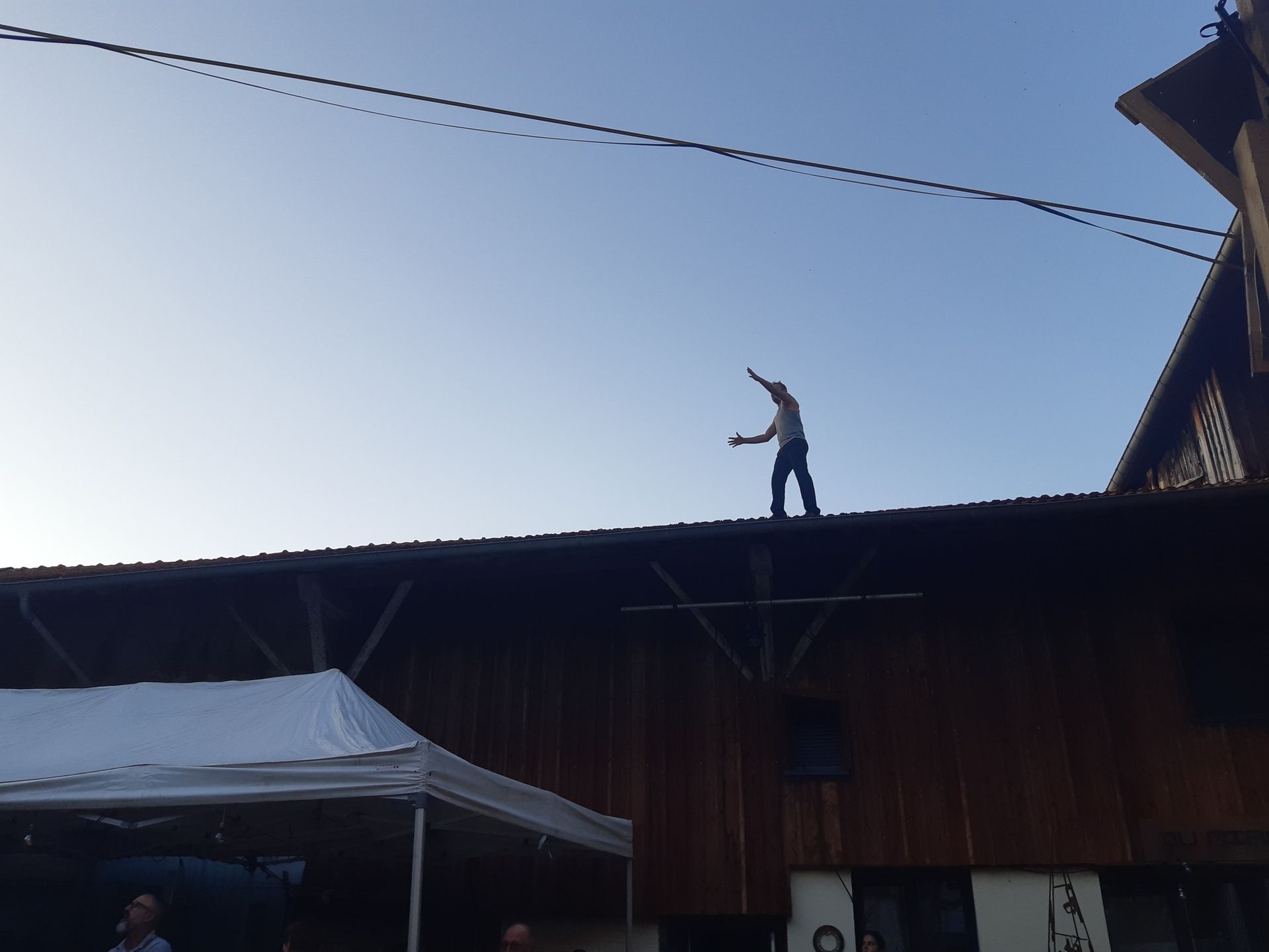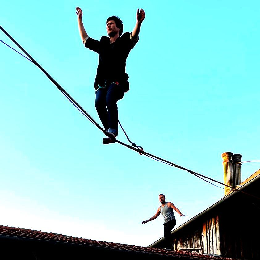 Un acrobate évolue sur une highline (slackline installée à grande hauteur) alors qu'un comédien évolue autour de lui à différentes hauteurs (sol, fenêtres, toit) en déclamant le poème éponyme de Jacques Prévert : Salut à l'oiseau.